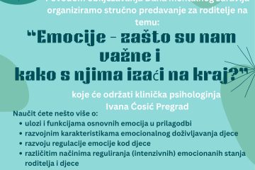 Poštovani roditelji, povodom obilježavanja Dana mentalnog zdravlja 8. listopada 2025. organizirali smo stručno predavanje za roditelje na temu: “Emocije – zašto su nam važne i kako s njima izaći na kraj?” Kada? 8. listopada 2025. (srijeda) Gdje? Polivalentna dvorana u OŠ Ivanja Reka Gost predavač: Ivana Ćosić Pregrad, klinička psihologinja